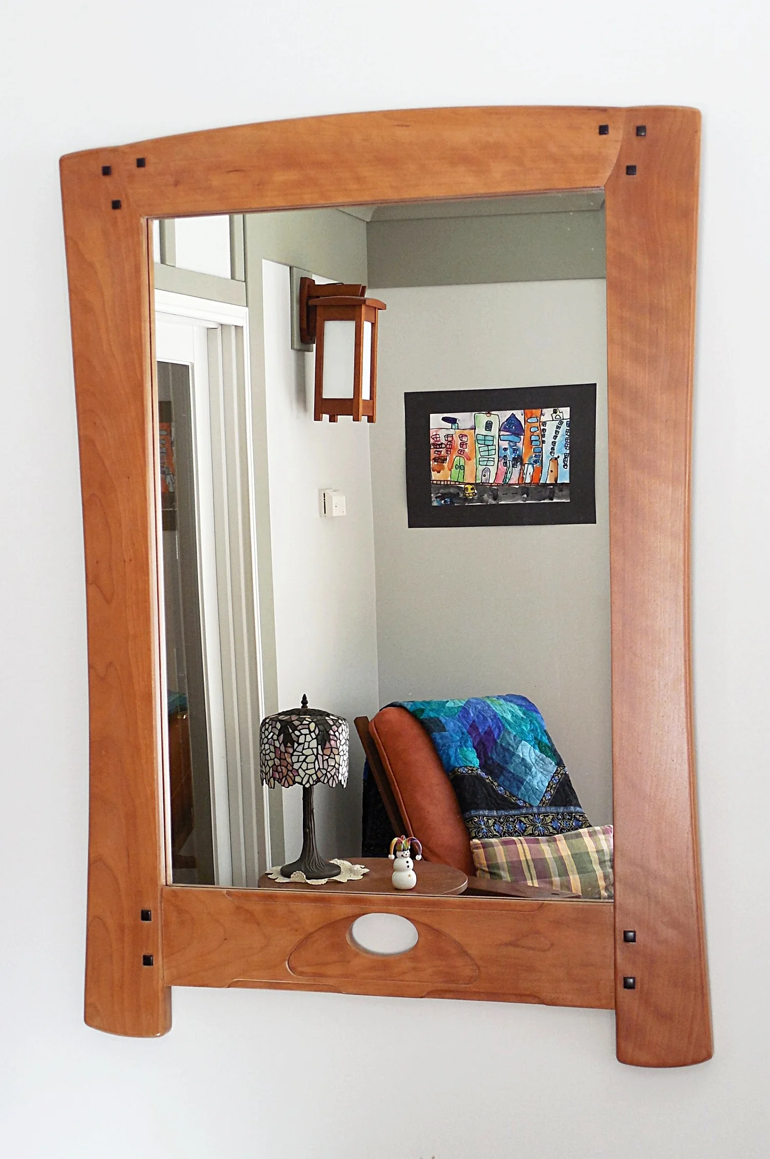The Aurora Mirror is handcrafted from cherry and stained glass. Inspired by the west coast architects Greene & Greene, the curves of the sides and top complement the cloud lift styling of the handcrafted stain glass. Windowsill detail along with the round pegs add the finishing touch of detail to the piece.